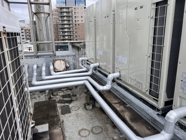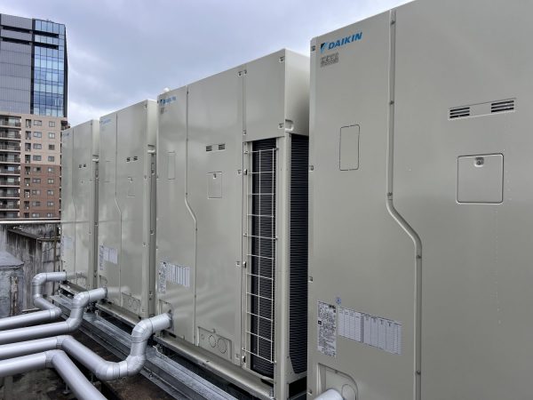 室外機ビルマル2階~5階10馬力4系統 16トンラフタークレーンにて設置